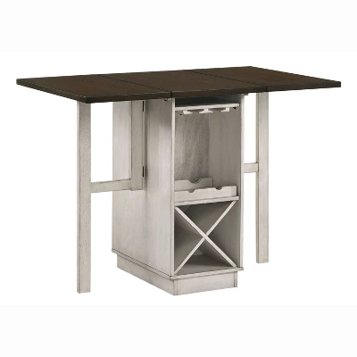 The ultimate in versatility, perfect for a compact space, this five-piece counter height dining set includes a drop-leaf design and backless stools. With stemware and wine bottle racks in the table base, this ingenious design keeps favored vintages close at hand. This eco-friendly frame is constructed from rubberwood, a tropical, solid wood taken from rubber plantations.