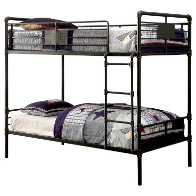 Bring cool style to your kid’s bedroom with the Derrick Kids Bunk Bed from HOMES: Inside + Out. The steel frame shows off an iconic industrial-inspired piping accent for a charming and sophisticated style your kids will love. It is complete with guard rails on the top bunk to help keep them from rolling out of bed in the middle of the night. Sleek rust accents add to the old industrial style of the bunk bed.