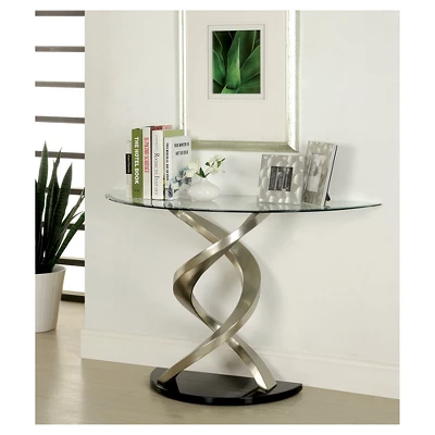 HOMES: Inside + Out Kelsi Modern Twisting Glass Top Satin Plated Sofa Table is an extraordinary piece on an ordinary day. The 8mm clear tempered glass oval table top is supported upon a statuesque satin plated swirl shaped metal post. This piece boasts a beautiful design with a contrasting bold colored solid base. The HOMES: Inside + Out Kelsi Modern Twisting Glass Top Satin Plated Sofa Table is complete with a sleek design ideal for dressing up a bare wall.
