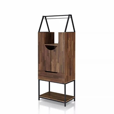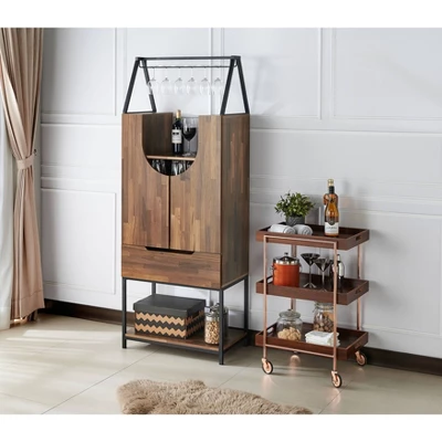 Give your home a charming modern industrial touch with this birdhouse inspired wine cabinet. A roof-shaped metal rack hangs glasses while a U-shaped cut-out offers a place to serve. The double-door cabinet houses a 5-slot bottle holder to keep wine protected. With plenty of convenience shelving and a drawer for wine essentials.