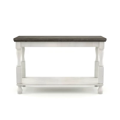Sink into the rustic, modern farmhouse ambiance of this charming wooden console table. It pairs a soft gray wood grain finish tabletop with an antique white finish base that adds traditional turned legs and a full lower shelf for added storage and display. Table legs are crafted from pine wood with manufactured wood surfaces are extra durable and resistant to damage for lasting enjoyment.