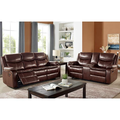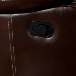 Ideal for entertainment areas or spacious living rooms, this reclining sofa invites you to kick up your feet and indulge yourself by binging on the game of favorite TV series. Wrapped in a soft and supple brown Faux leather with plush arm rests and headrests, this casual furniture piece works perfectly in laid back, transitional homes and features extra details such as contrasted stitching.
